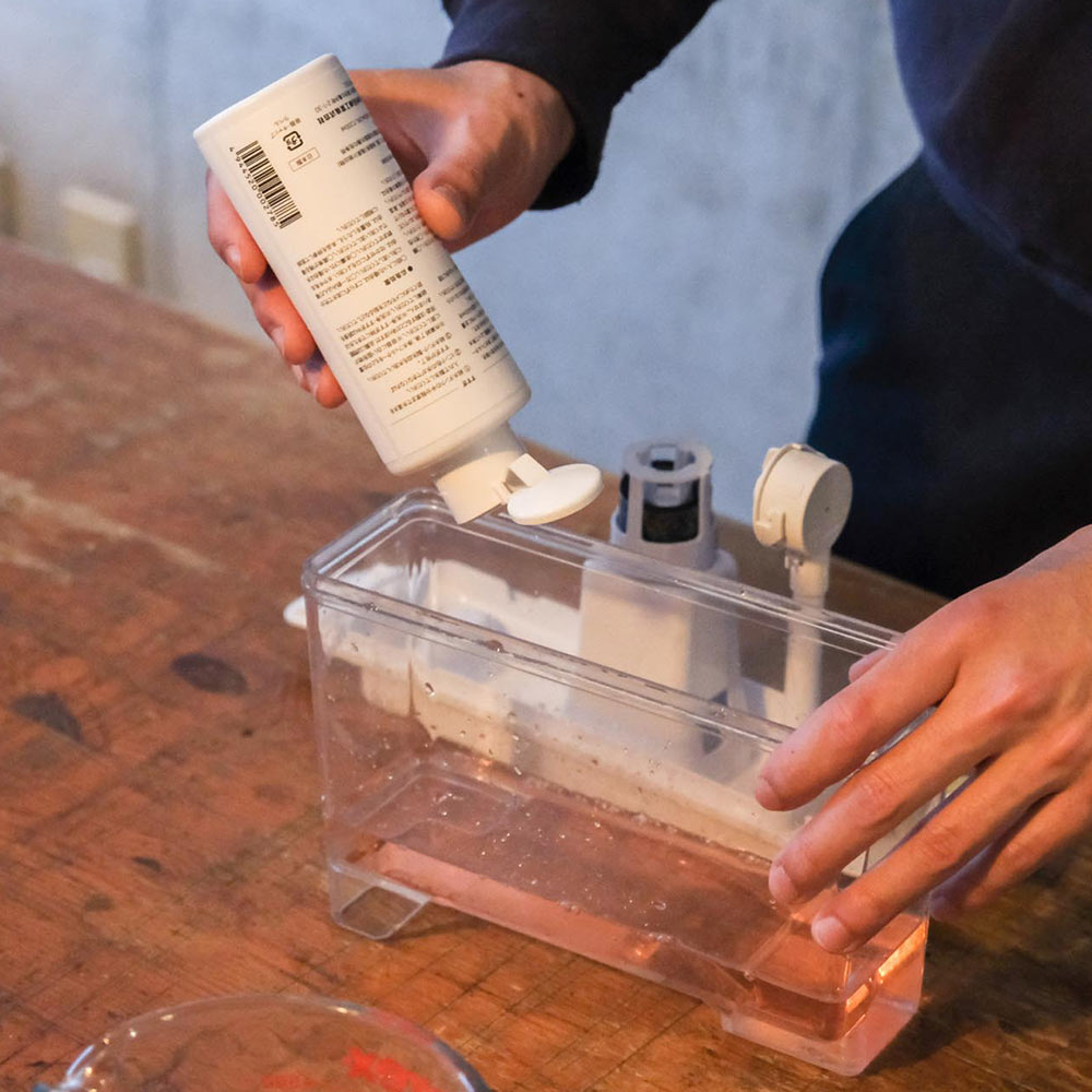・タンク内部の水面より上の汚れは落ちません。粉末を投入後にブラシなどでこすり洗いしてください。