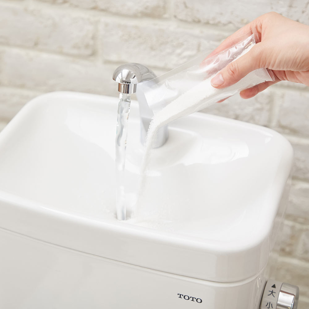 一度排水し、トイレタンクの手洗い用排水口から給水中に本剤1包を入れてください。