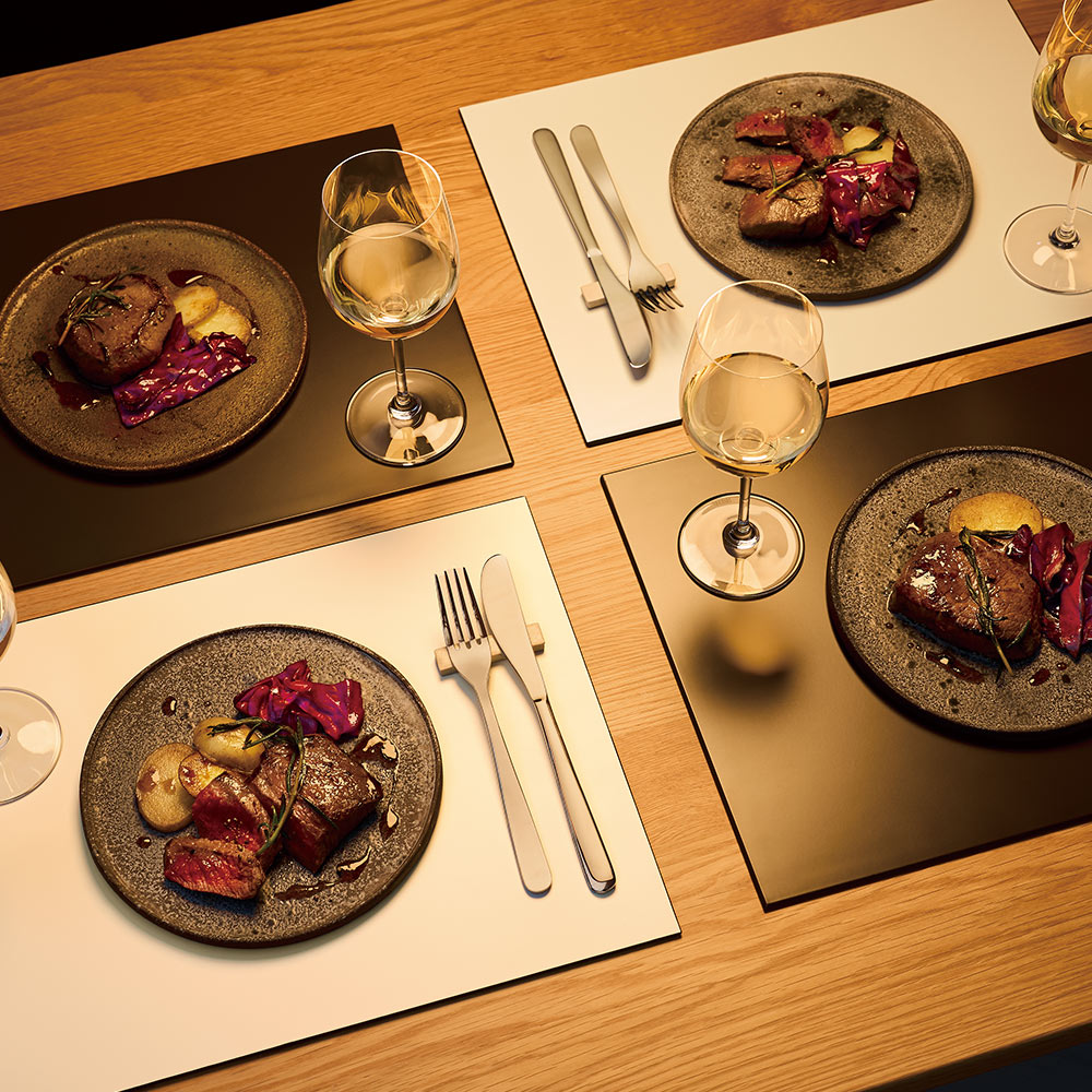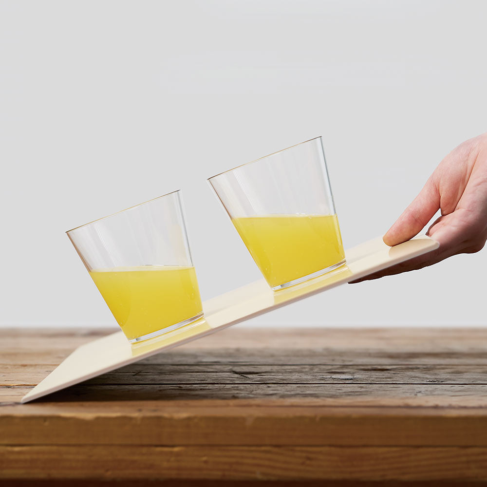 食卓の風景が、少しだけ引き締まる。「ダイニングトレー」は、表と裏で異なる色を楽しめるリバーシブル仕様。軽やかな薄さと、手に取りやすい斜めカットの縁が特徴です。