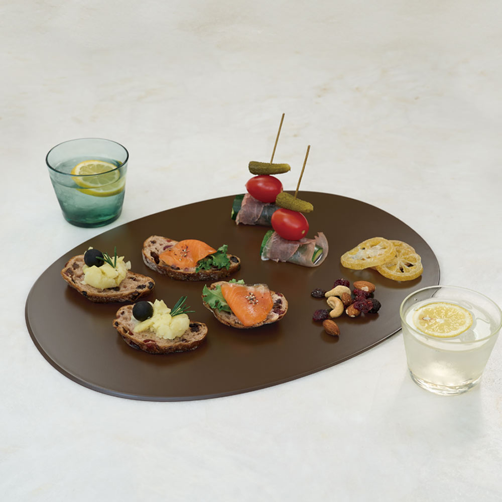 エッジ部分は斜めに削られており、スッと持ち上げられる工夫も。わずか数ミリの厚みの中に、快適な使い心地が凝縮されています。カラーは表裏で異なるリバーシブル仕様。日々の食事から、おもてなしや特別な日の盛り付けまで、シーンを選ばず使えるトレーです。