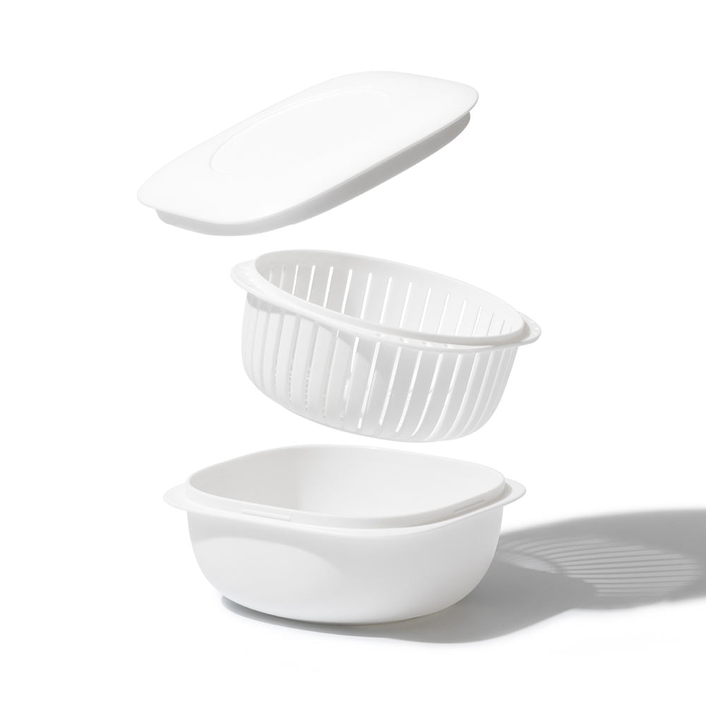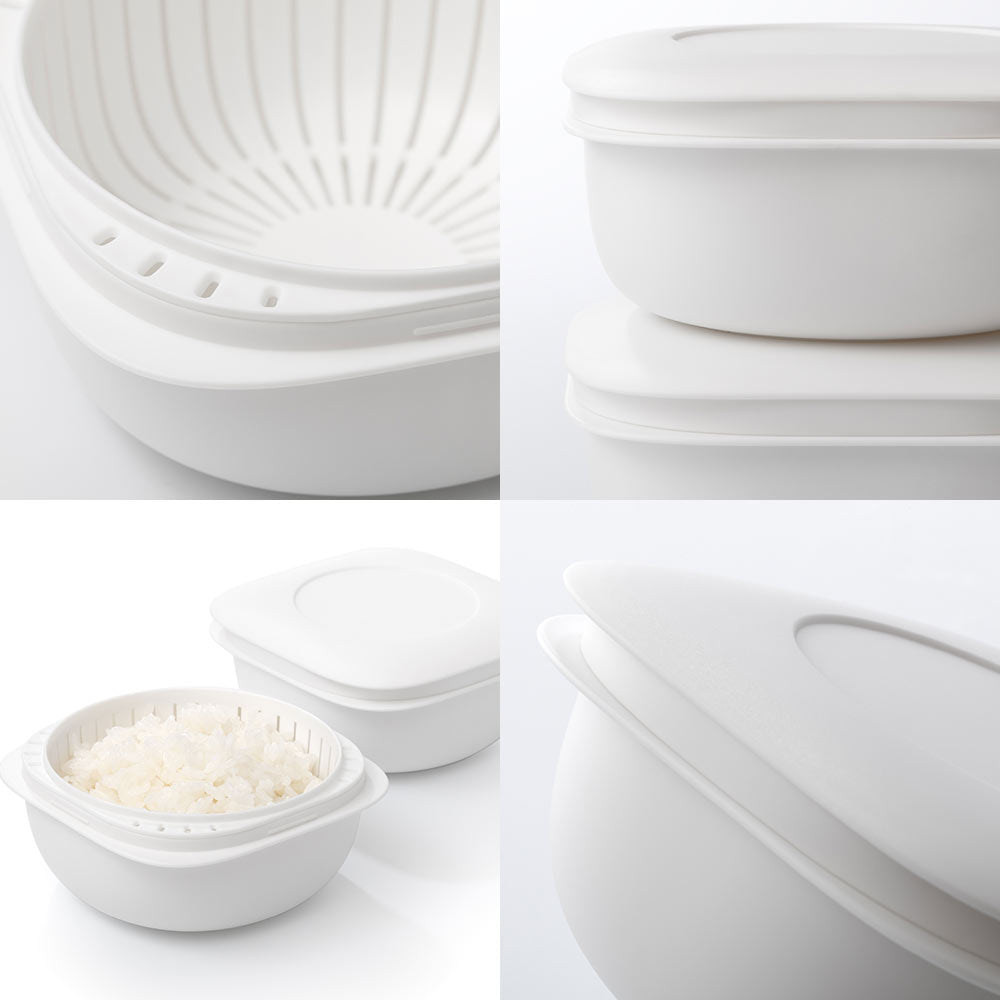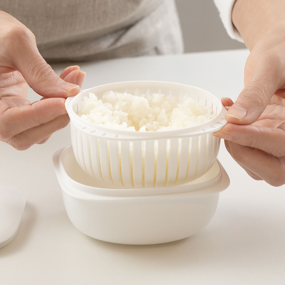 この容器のポイントは、蒸気の力でごはんを温める構造と「ザル型二重構造」。