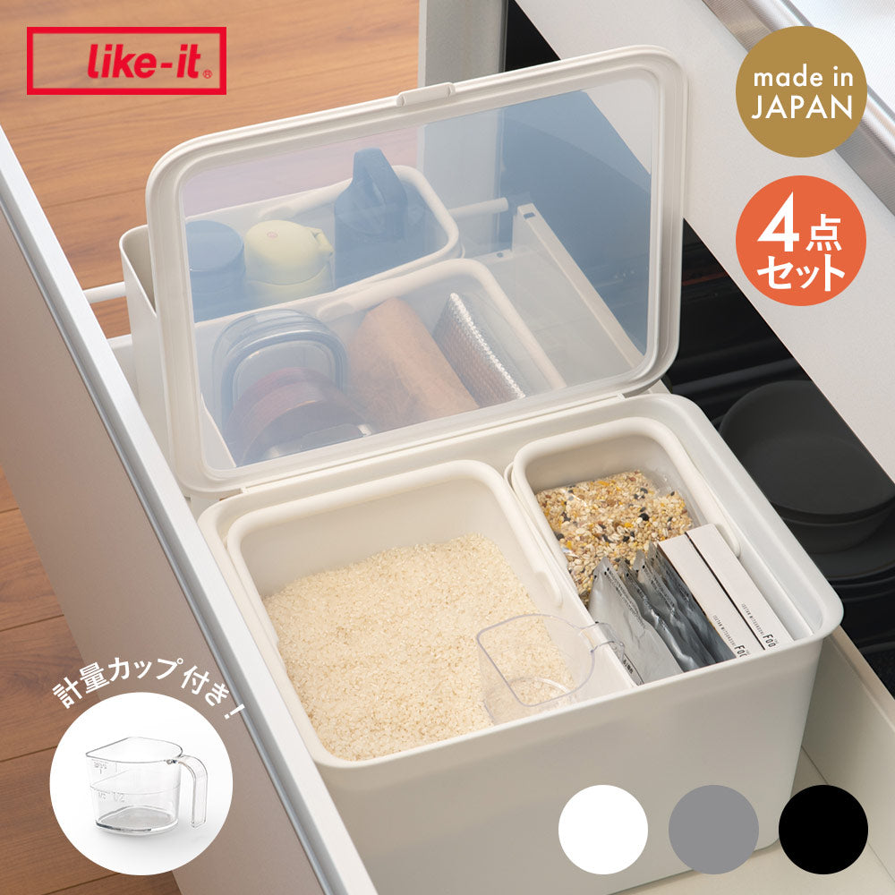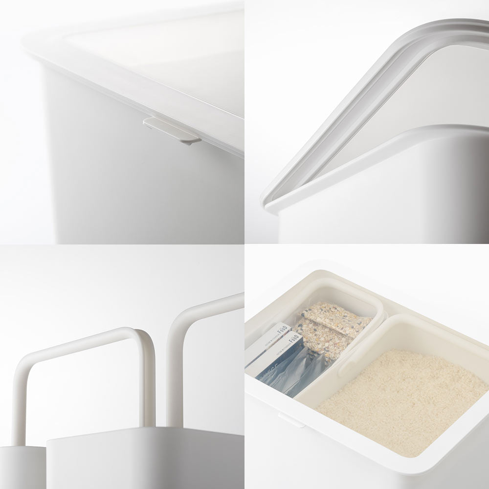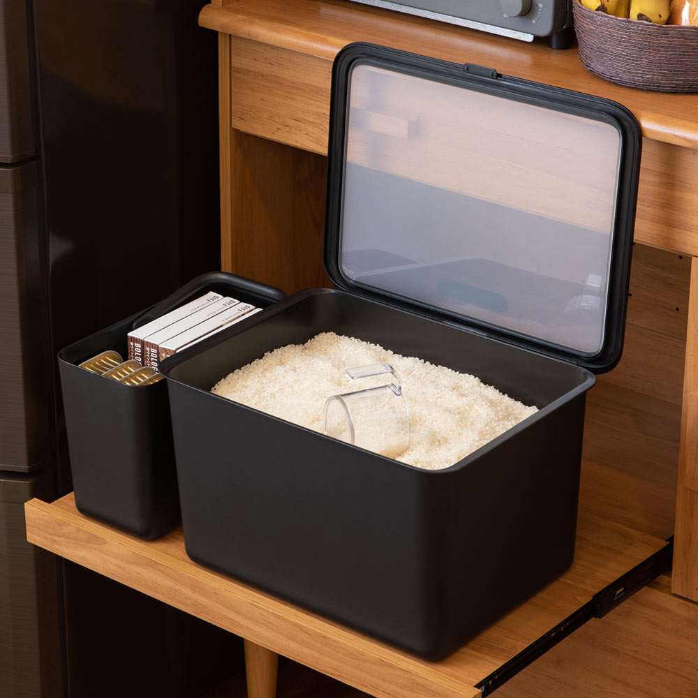 湿気やにおい移りを防ぎながら、すっきり収納できるのが「フタ付きストックケース 米びつ」。