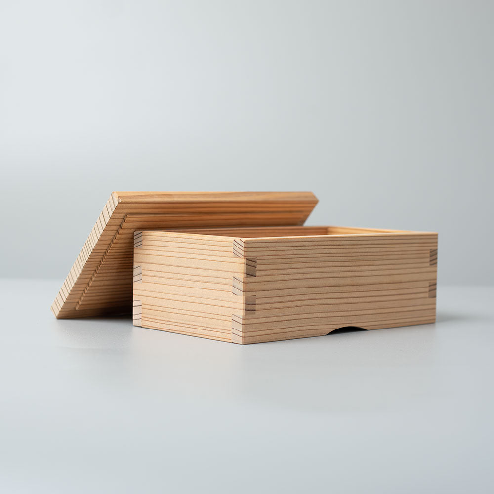 釘や接着剤に頼らず、枡(ます)作りで用いられる伝統技法「アラレ組み」仕上げ。 裏面から串を打ち込むことで、接着剤なしでもバラバラにならない堅牢な造りに。 ご飯の美味しさが際立つ「杉」の力