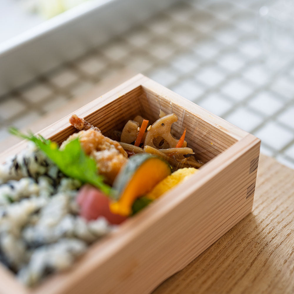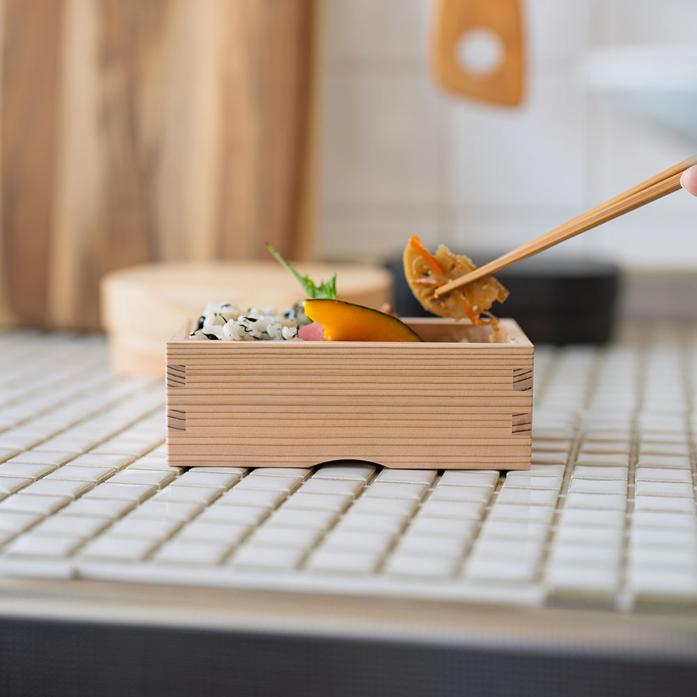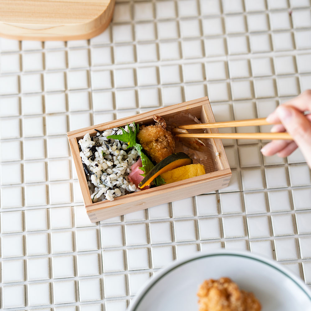曲げわっぱ同様、天然杉の調湿作用により、時間が経ってもご飯がべたつかず、美味しさをキープします。