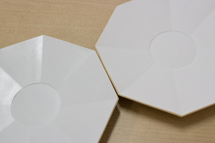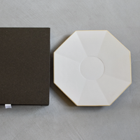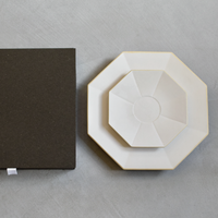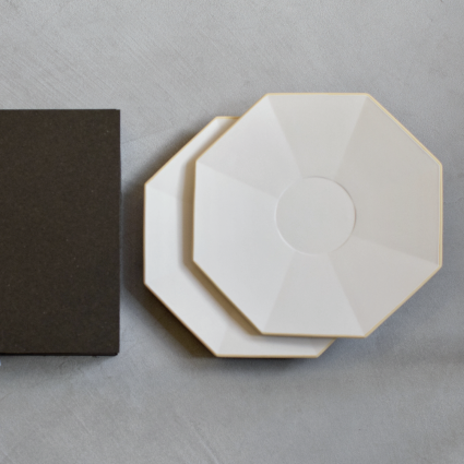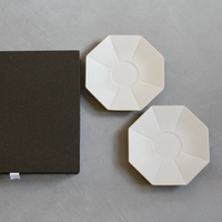 末広がりの八角形に円満のメッセージを込めて真ん中に円を配したかたち。マットな白と釉薬をかけていないふちの素地がシンプルに見せてくれます。