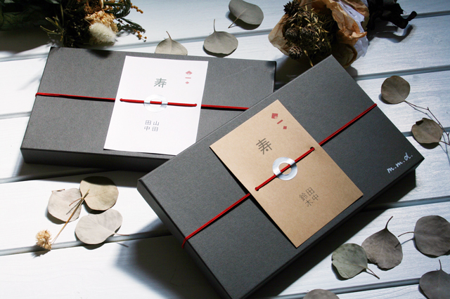 モダンで可愛らしい m.m.d. オリジナルの熨斗もついています。のし紙色はホワイトとブラウンの2種類をご用意。